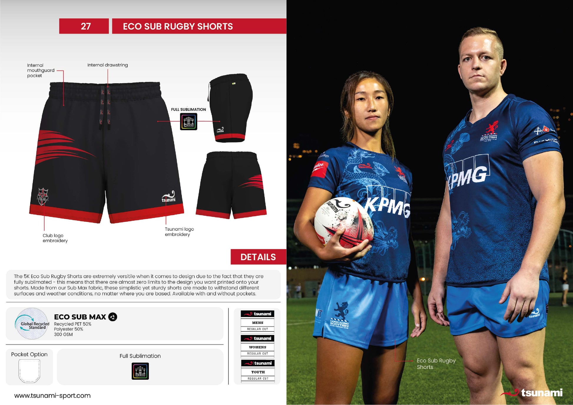 The Eco Sub Rugby Shorts are extremely versatile when it comes to design due to the fact that they are fully sublimated-this means the there are almost zero limits to the design you want printed onto your shorts. Made from our Sub Max fabric, these simplistic yet sturdy shorts are made to withstand different surfaces and weather conditions, o matter where you are based. Available with or without pockets.