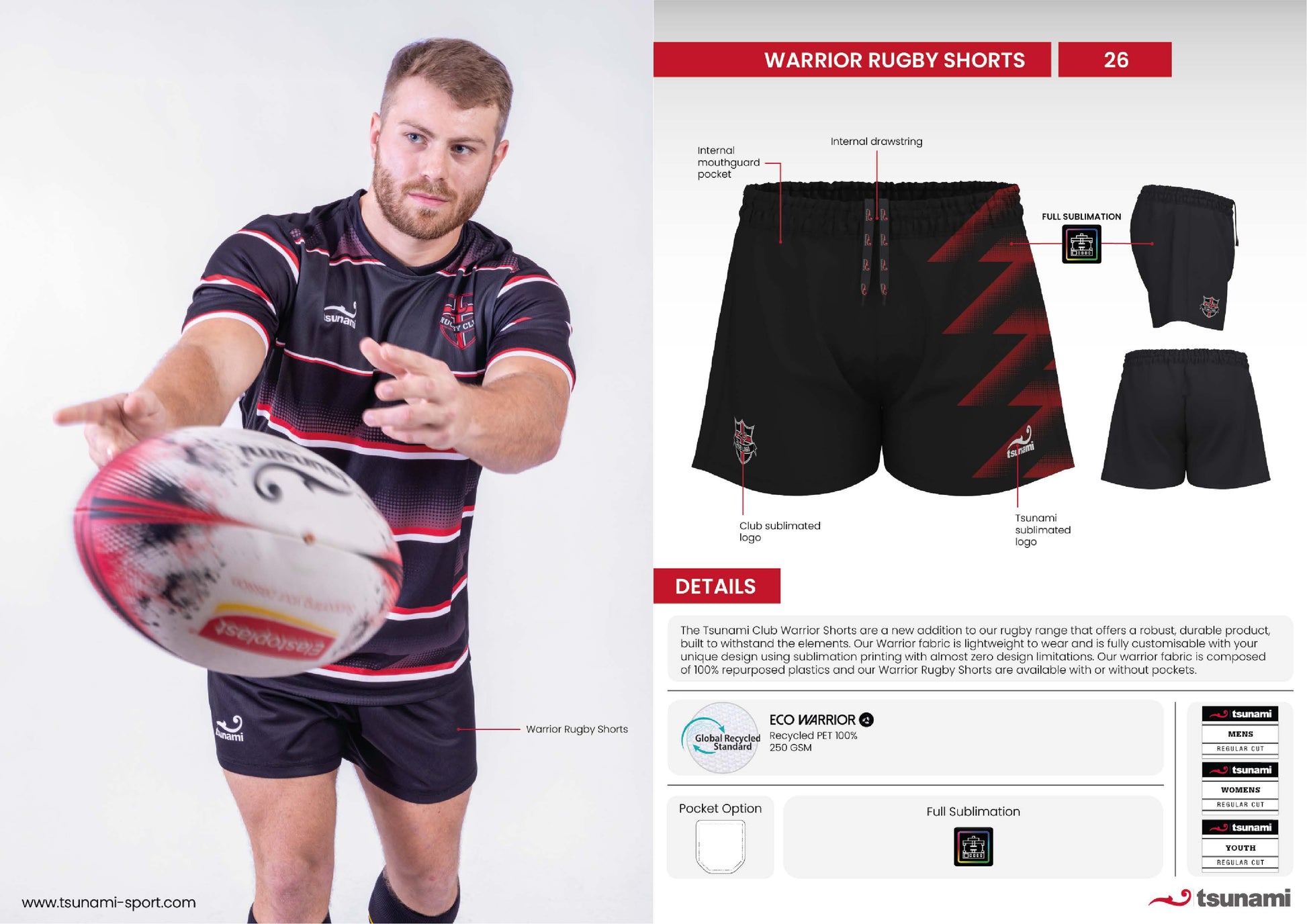 The Club Warrior Shorts are ca new addition to our rugby range that offers a robust, durable product, built to withstand the elements. Our Warrior fabric is lightweight to wear and is fully customizable with your unique design using sublimation with almost zero design limitations. Our warrior fabric is composed of 100% repurposed plastics and our Warrior Rugby Shorts are available with out without pockets.