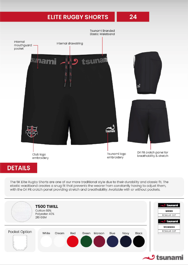 The 5K Elite Rugby Shorts are one of our more traditional style due to their durability and classic fit. The elastic waistband creates a snug fit that prevents the wearer from constantly having to adjust them, with the Dri Fit crotch panel providing stretch and breathability. Available with or without pockets