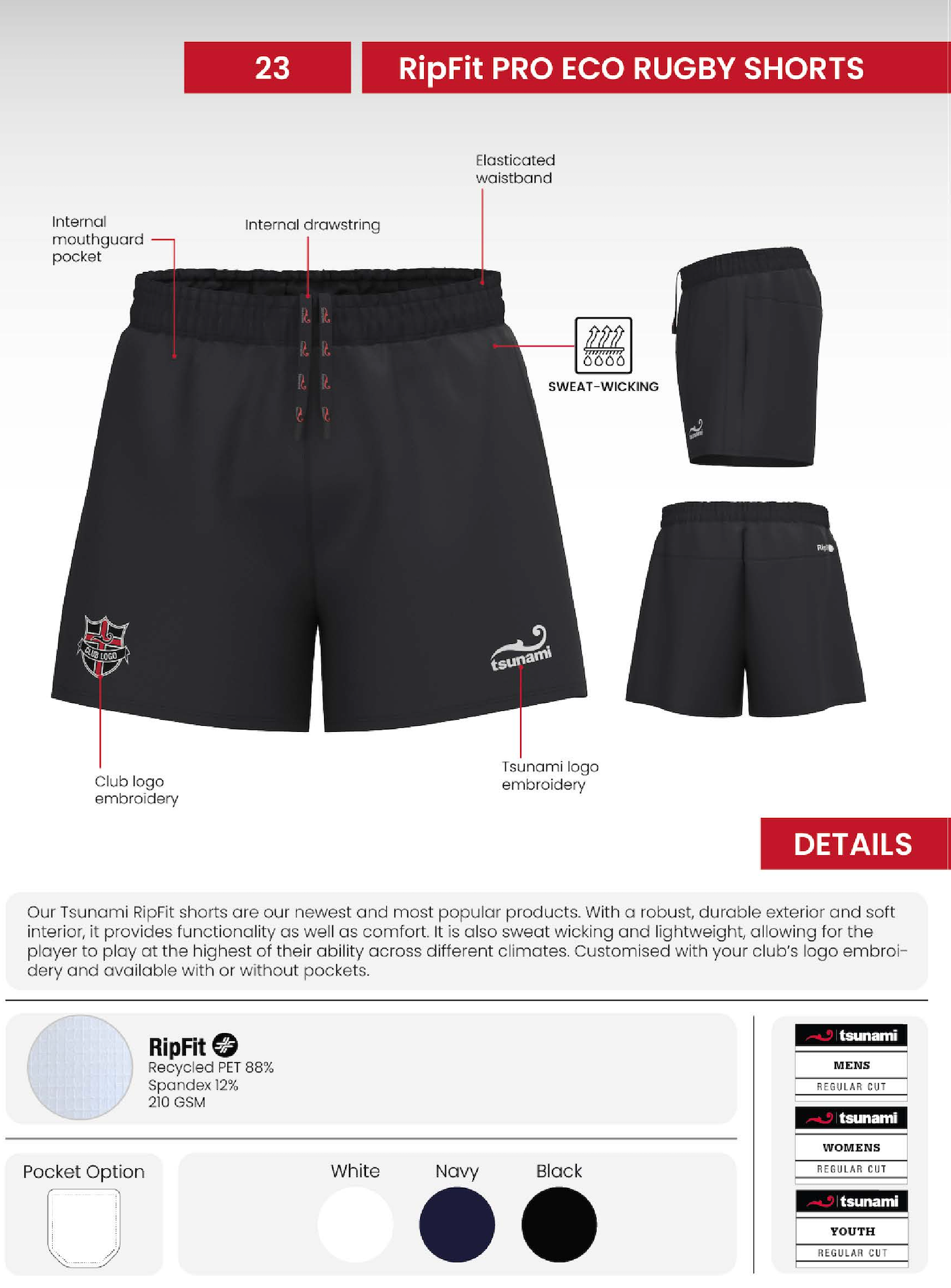 Tsunami RipFit shorts are our newest and most popular products. With a robust, durable exterior and soft interior, it provides functionality as well as comfort. It is also sweat wicking and lightweight, allowing for the player to play at the highest of their ability across different climates. Customised with your clubs logo embroidery and available with or without pockets.